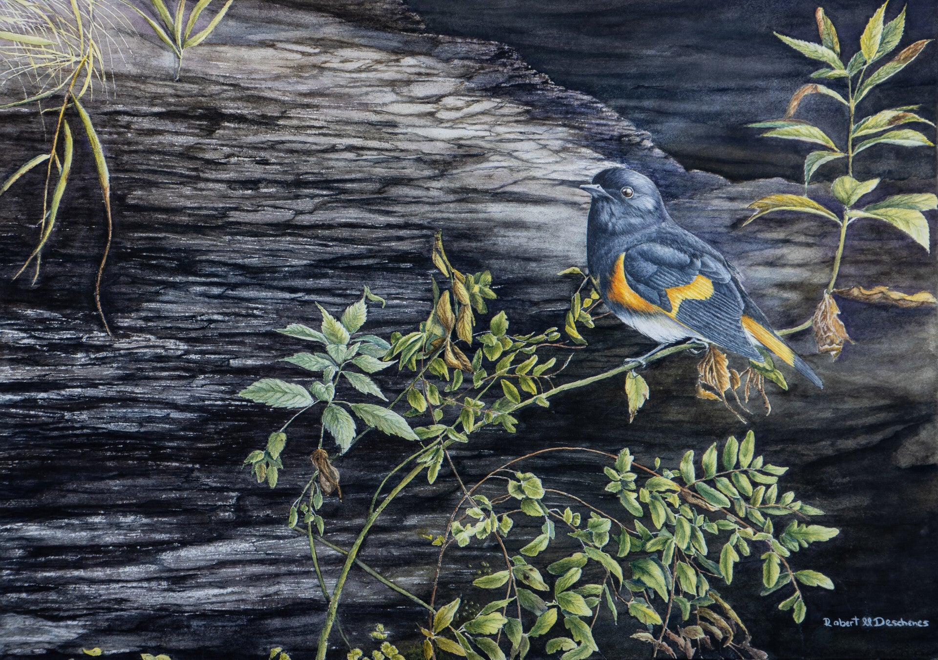 Dans cette œuvre une paruline flamboyante, est représenté. L'oiseau se trouve perché sur une branche, tourné de profil. Son plumage est composé de teintes grises sur le dos et le haut du corps, de touches d'or vif sur les flancs et une partie blanche sous le ventre. Les détails des plumes sont soigneusement rendus, donnant une impression de texture réaliste.